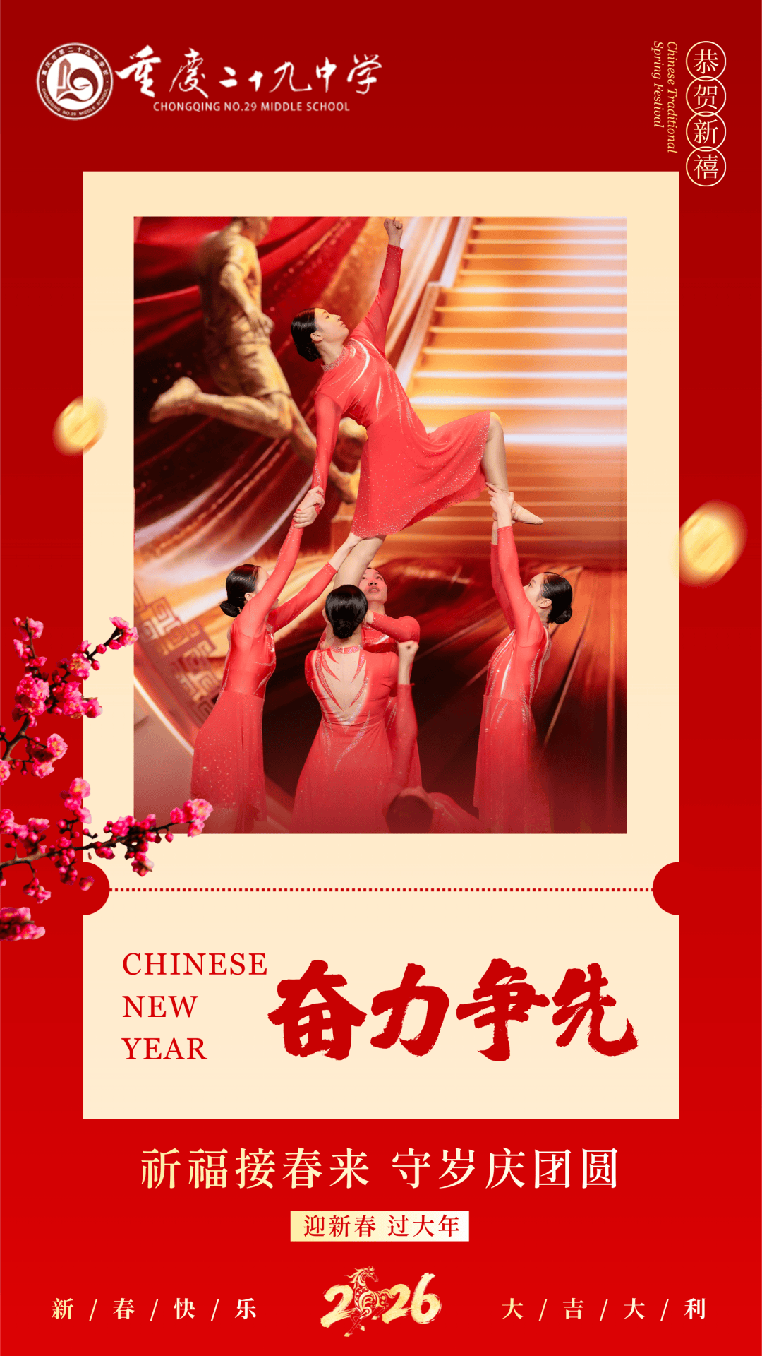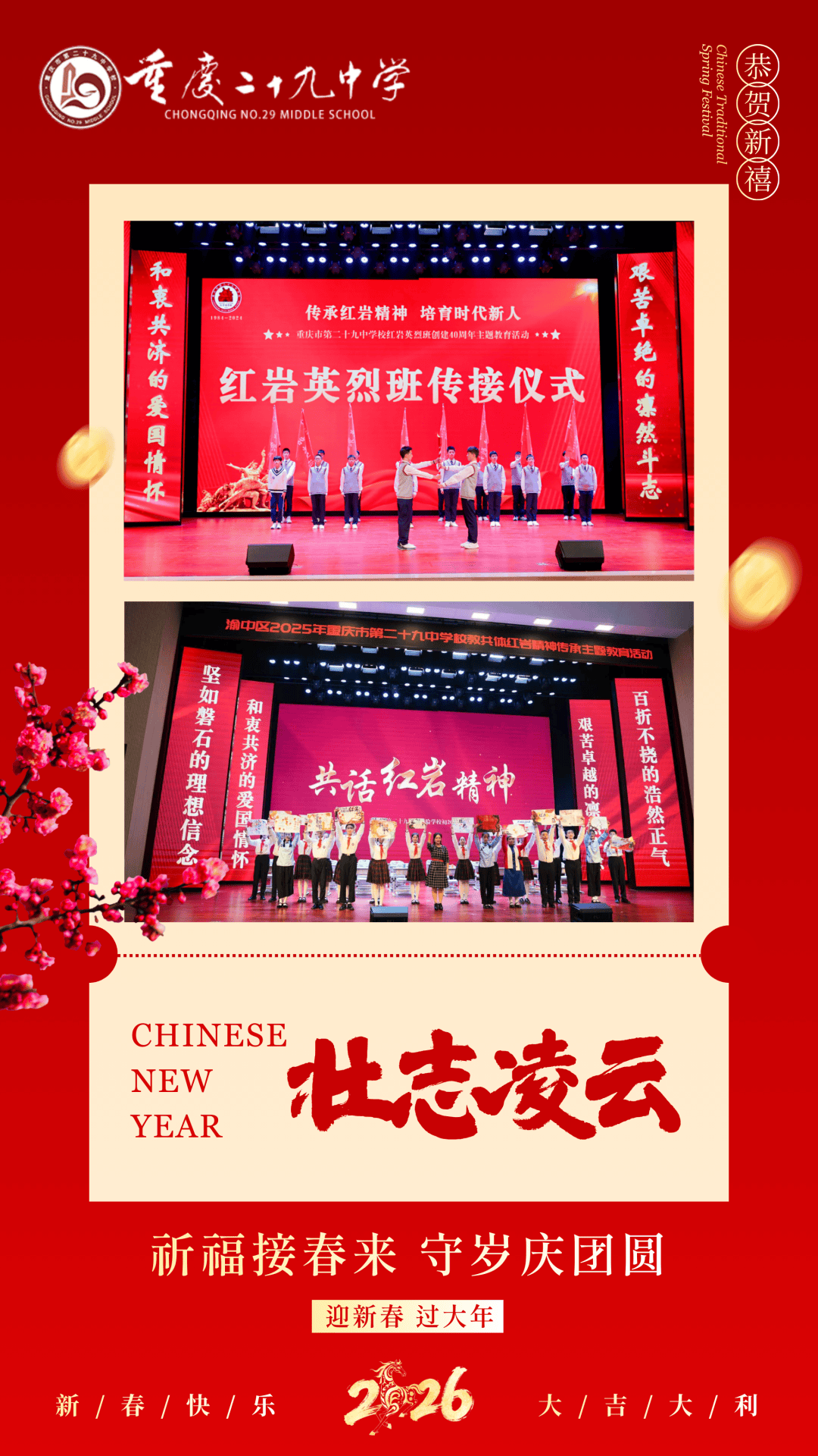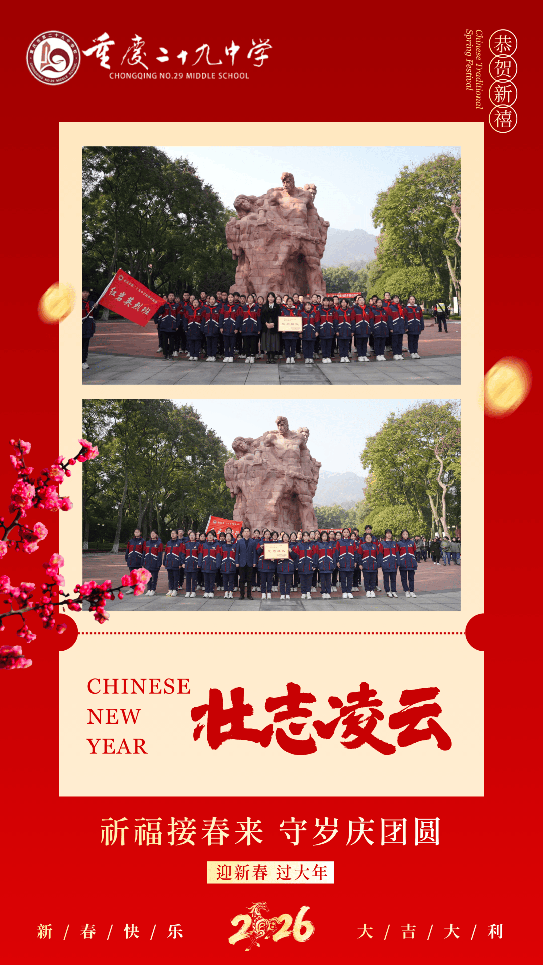 渝超,重庆城市足球联赛,渝超赛程,渝超直播,渝超积分榜,渝超球队/渝超(重庆城市足球联赛)为重庆足球迷带来最新赛程、比分、积分榜、球队信息及直播入口,精彩赛事一网打尽。当除夕夜的钟声渐渐远去,当第一缕晨曦越过渝中半岛的天际线,我们迎来了丙午马年的大年初一。此时此刻,解放碑的钟楼静默矗立,洪崖洞的灯火刚刚隐去,春晚的余韵还在千家万户的客厅里萦绕。在这个万家团圆的美好时刻,百年学府重庆二十九中,向天南海北的每一位二九人,道一声:新年好!