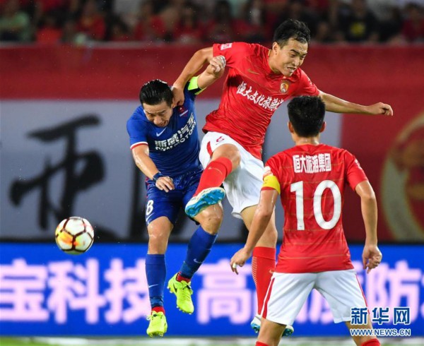 ↑7月29日,广州恒大队球员冯潇霆(中)与重庆斯威队球员丁捷争顶。新华社记者刘大伟摄