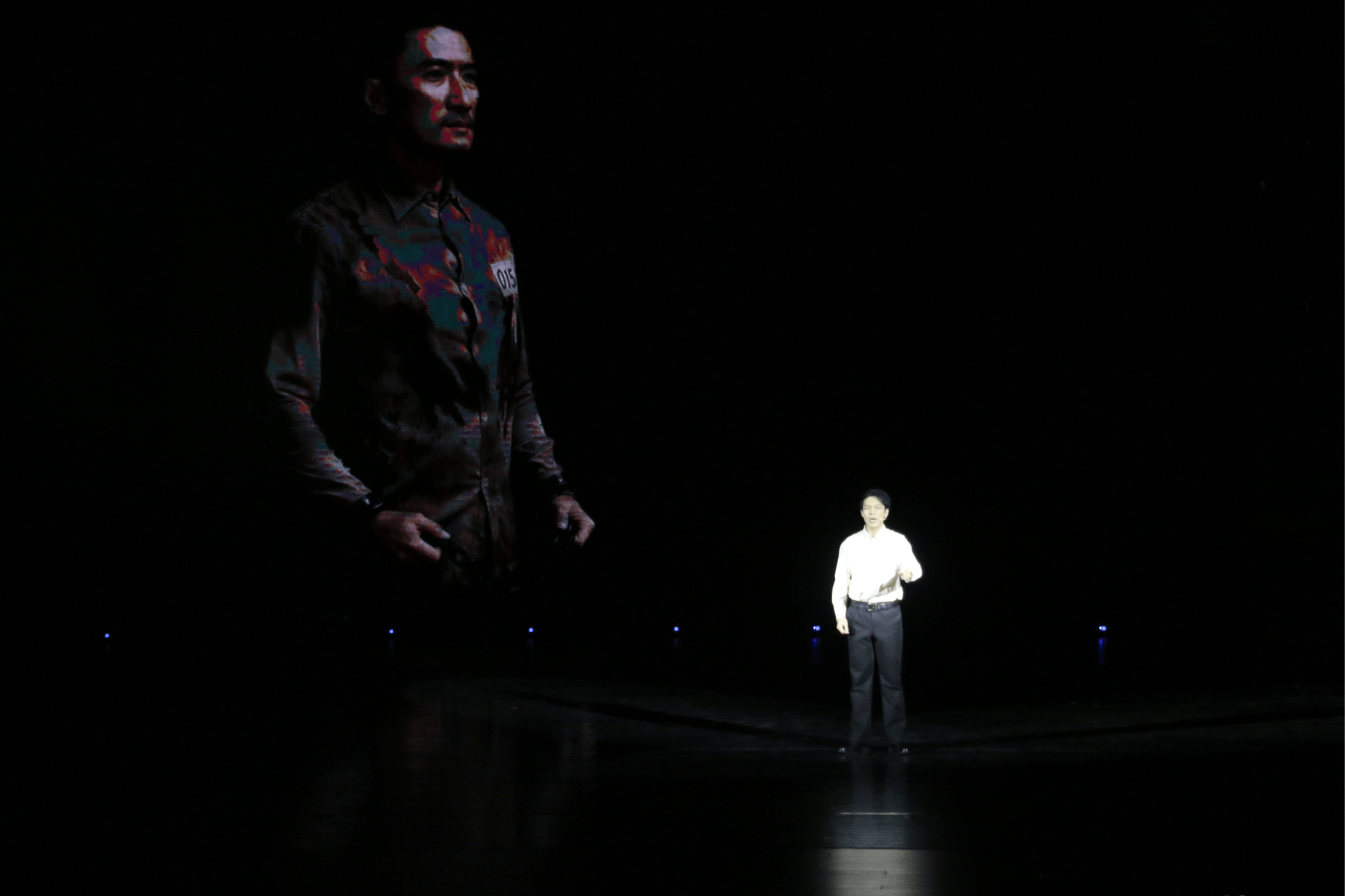 舞台灯光渐暖,由演员饰演的老年“蓝耕荒”深情讲述父亲蓝蒂裕留下的76字《示儿》诗稿。大屏幕上,通过AI技术复原的“蓝蒂裕”形象从历史的“囚窗”中走出,两代人在“盛世中国”实现了一场跨越时空的对话,“荒沙终将成林”的殷切嘱托感人至深。