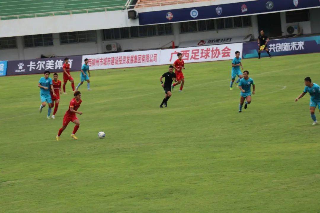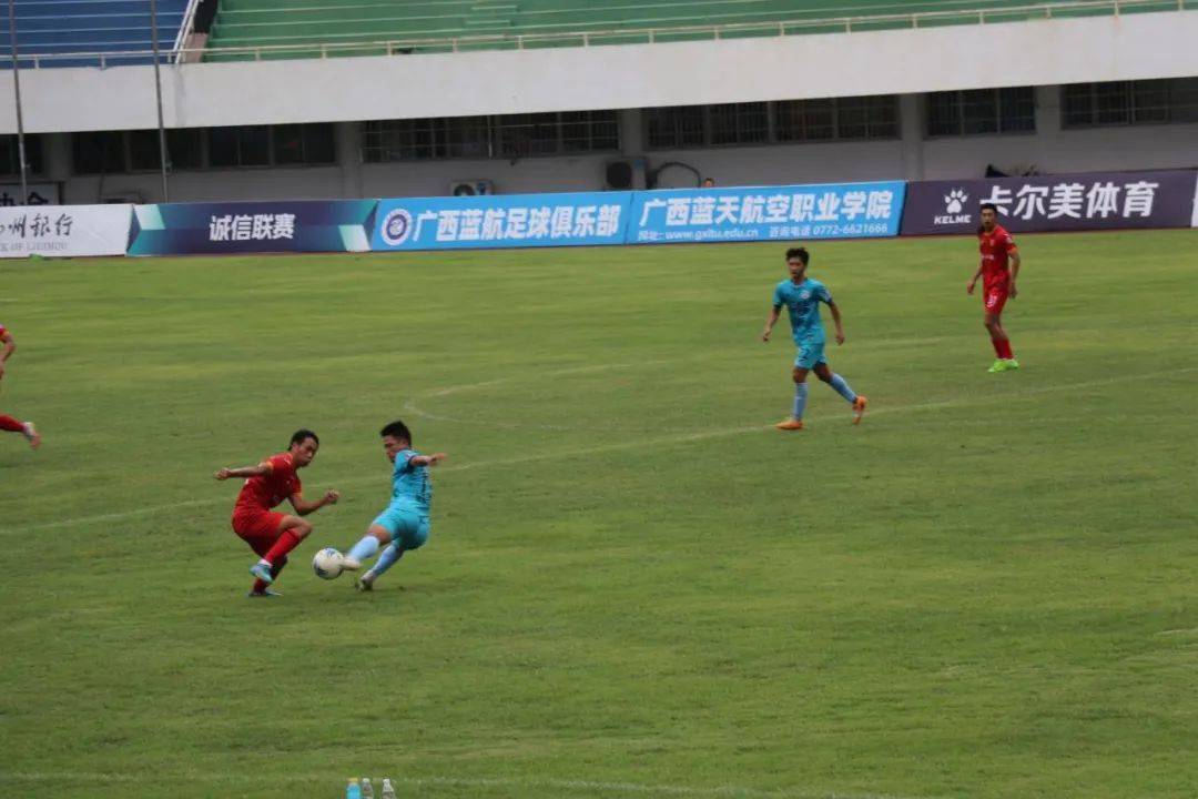 上半场结束,休息过后,球员们顶着雨水易边再战,拼搏劲不减。第57分钟,广西蓝航的球员以及重庆铜梁龙的李镇全因为在争抢过程中犯规被罚下,随后双方拼抢进入了白热化阶段,虽然进攻很猛,但都未找到机会进球。下半场伤停补时阶段,广西蓝航获得前场任意球机会,张晨龙直接任意球破门,最终两队比分锁定在1:1。