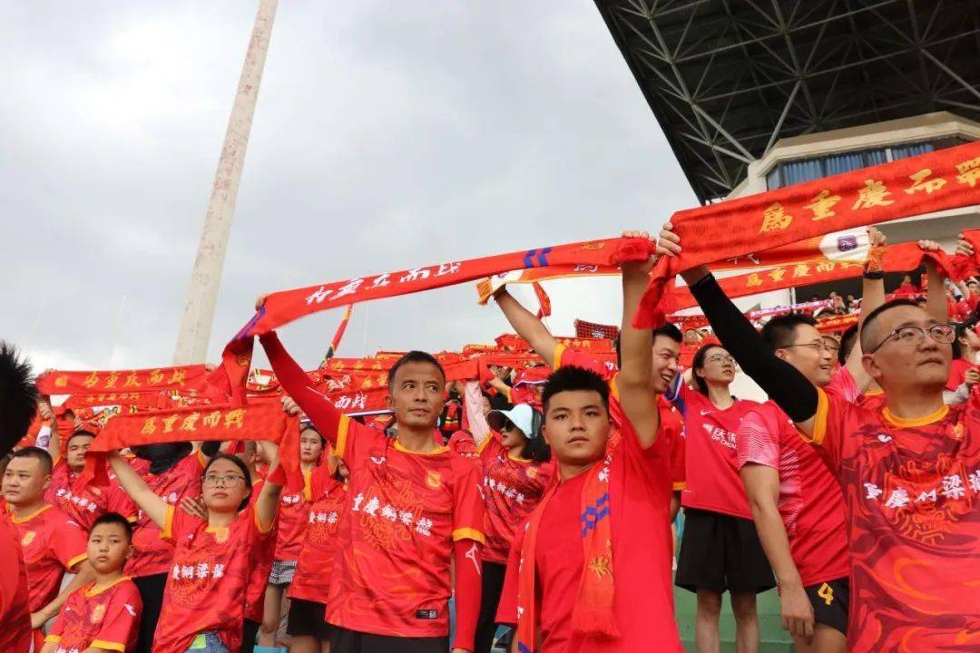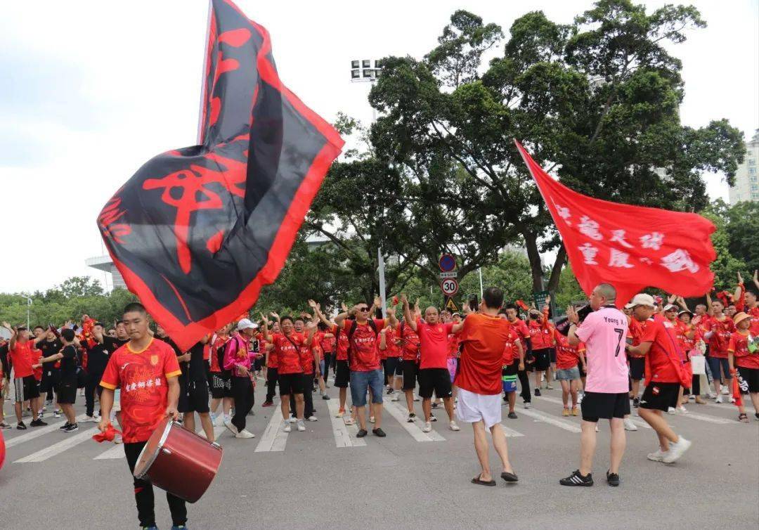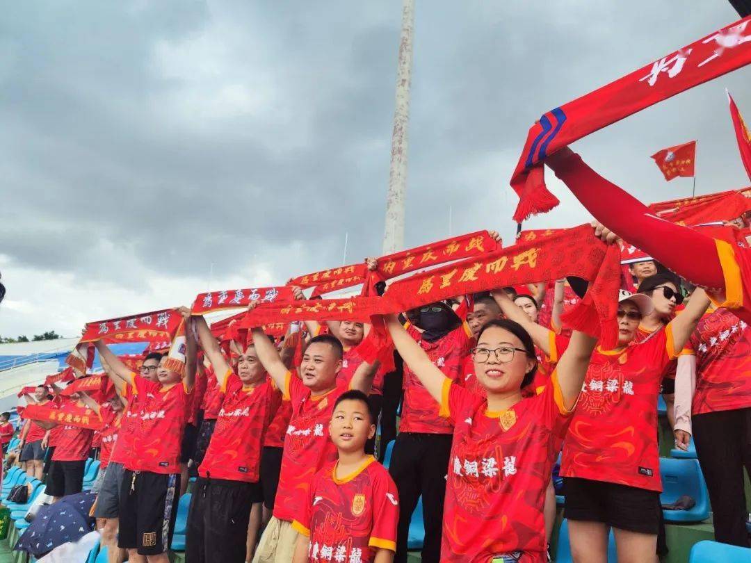 “重庆重庆,啦啦啦啦啦啦,我们在一起……”比赛开始后,重庆铜梁龙的球迷们身穿红色球衣,交替演唱几首热血澎湃的应援歌曲,用热情和激情点燃了整个赛场。