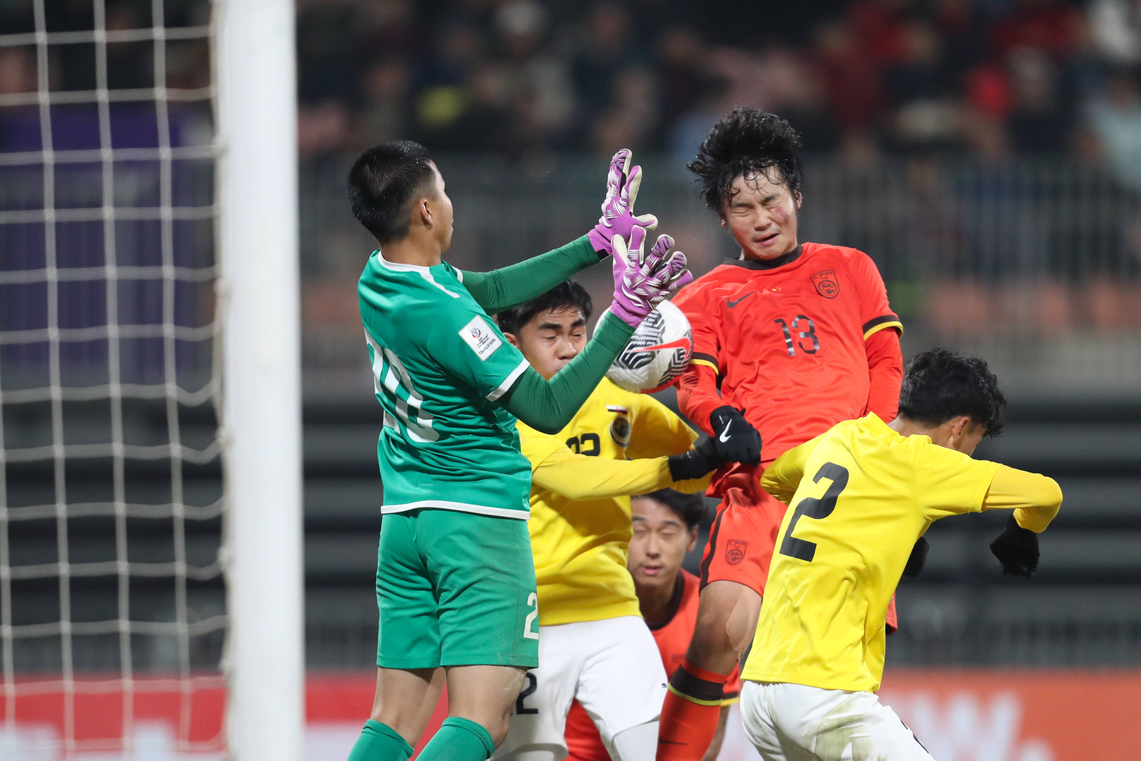 11月26日,中国队球员邝兆镭(左)和文莱队球员·达维什·伊扎特(中)在比赛中拼抢。 新华社记者 黄伟 摄