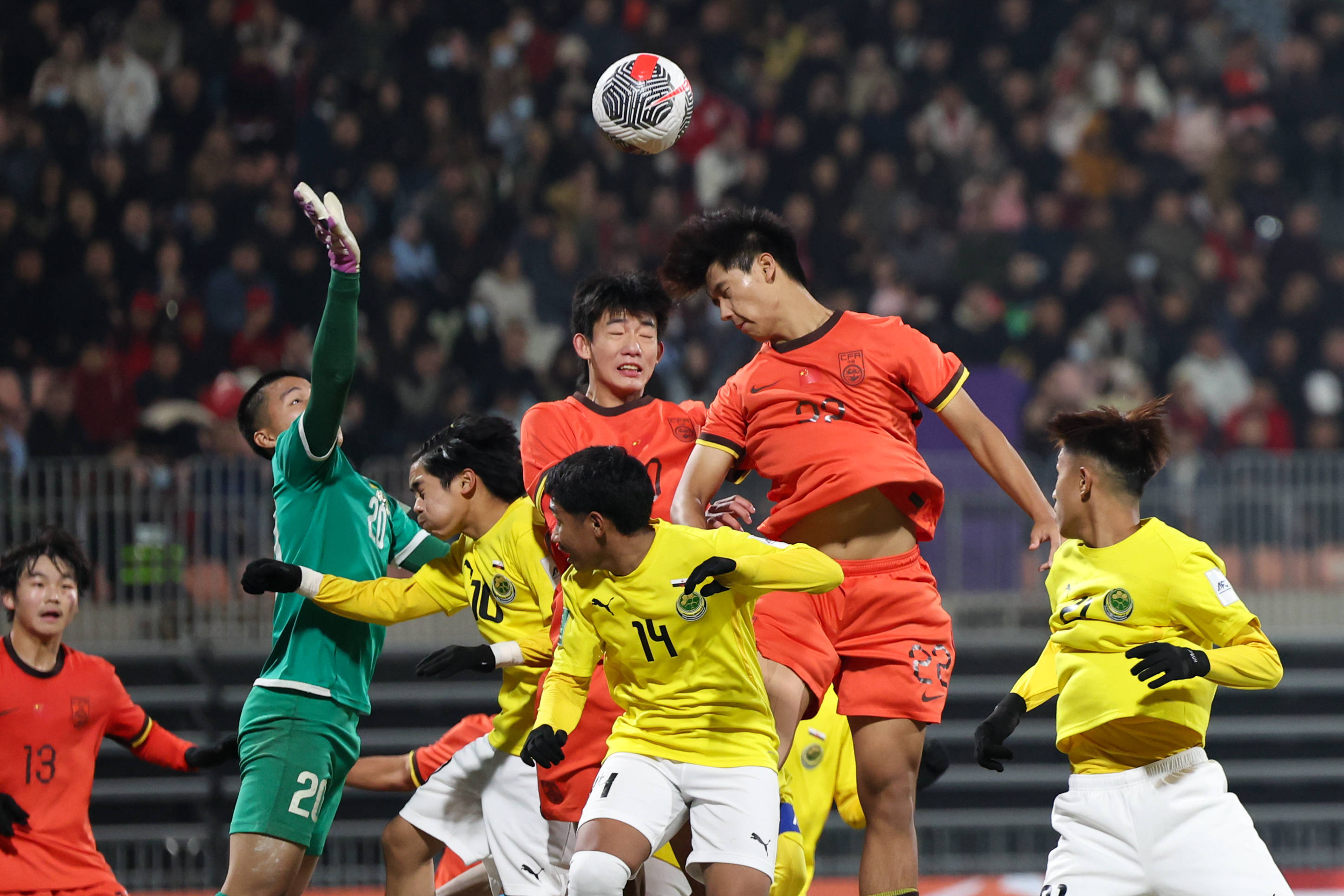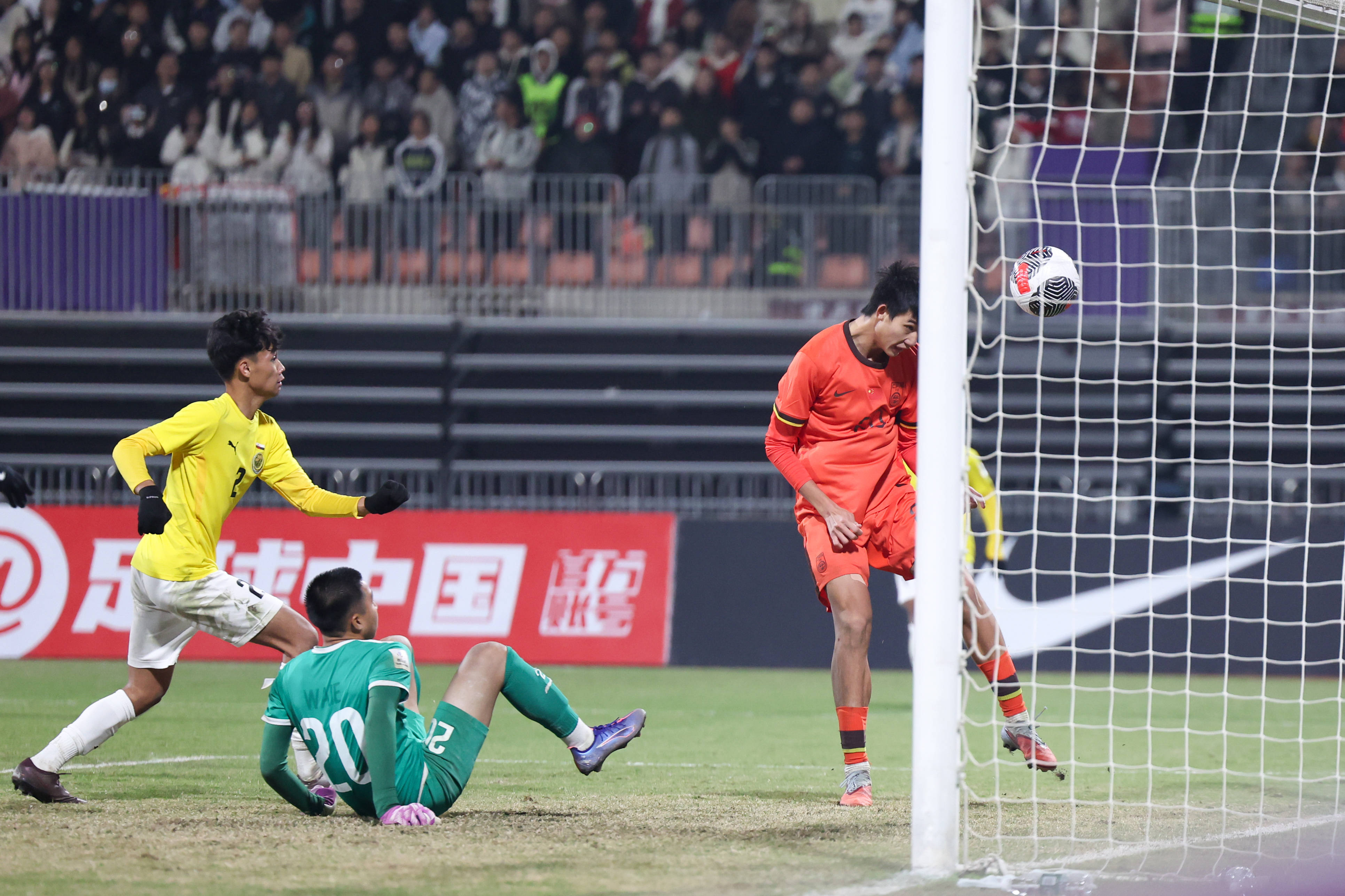 11月26日,中国队球员李铭杰(右二)在比赛中头球破门。 新华社记者 黄伟 摄