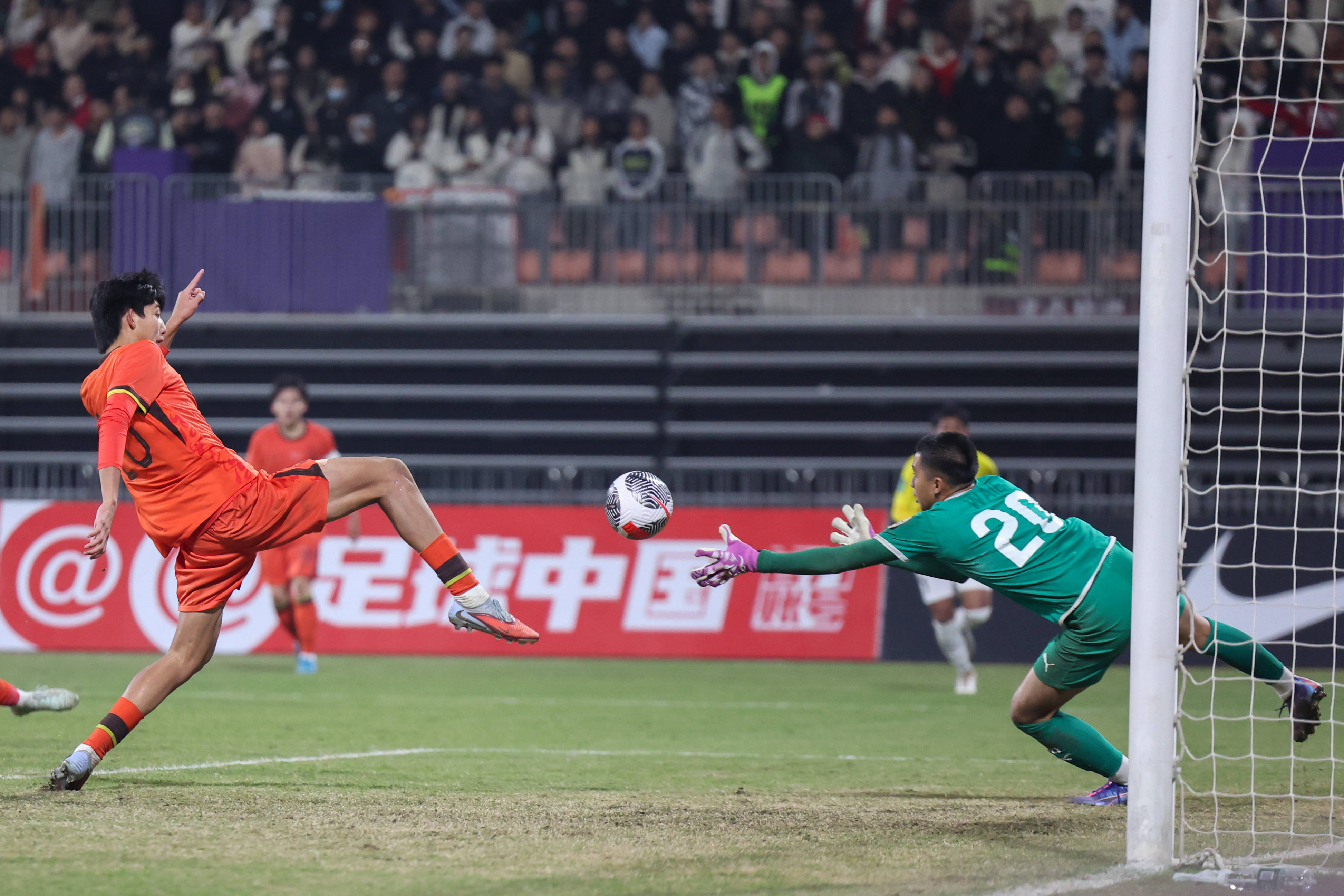 11月26日,中国队球员赵松源(右)在比赛中头球破门。 新华社记者 黄伟 摄