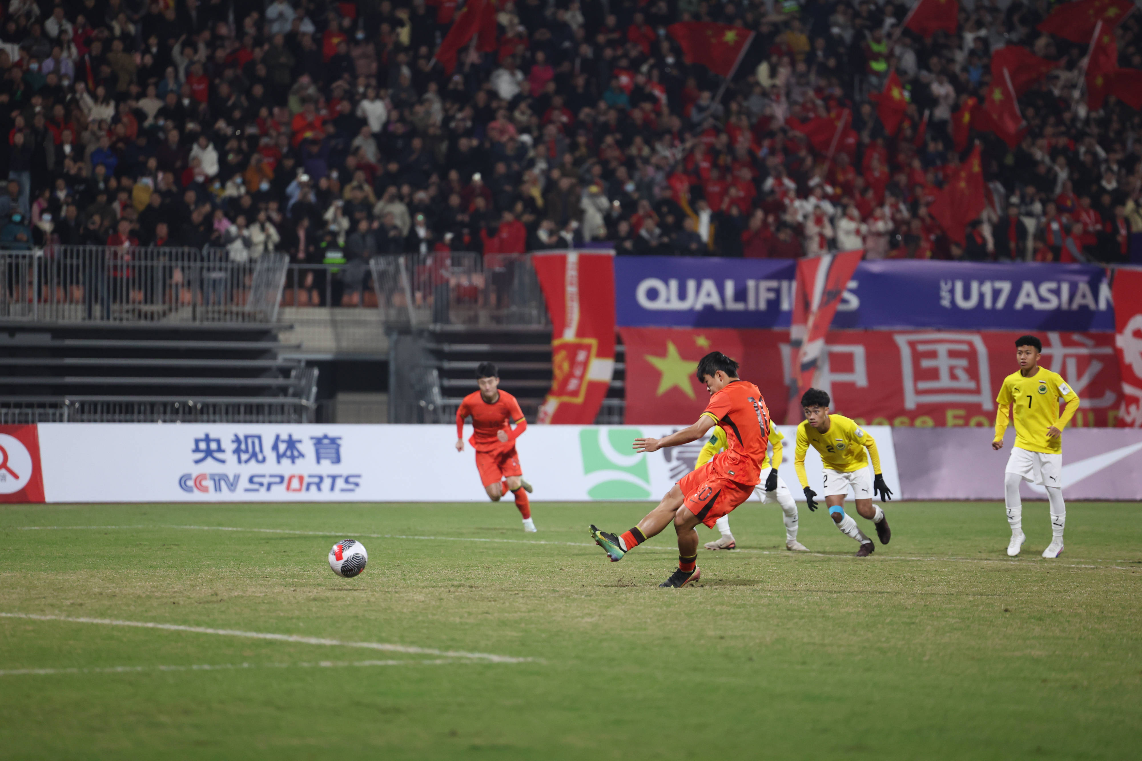 11月26日,中国队球员邝兆镭(前)在比赛中主罚点球。 新华社记者 黄伟 摄