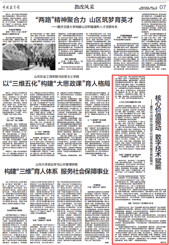 有两项重庆市教育规划课题通过结题验收,学校被评为区教育科研先进集体,校长魏昌龙等2人被评为先进个人。学生内驱力发展的“4+1”育人生态创新实践获涪陵区教学成果奖特等奖(全区仅4个特等奖)。中国教育报长篇报道了学校“核心价值驱动与数字技术赋能”双螺旋发展模式。