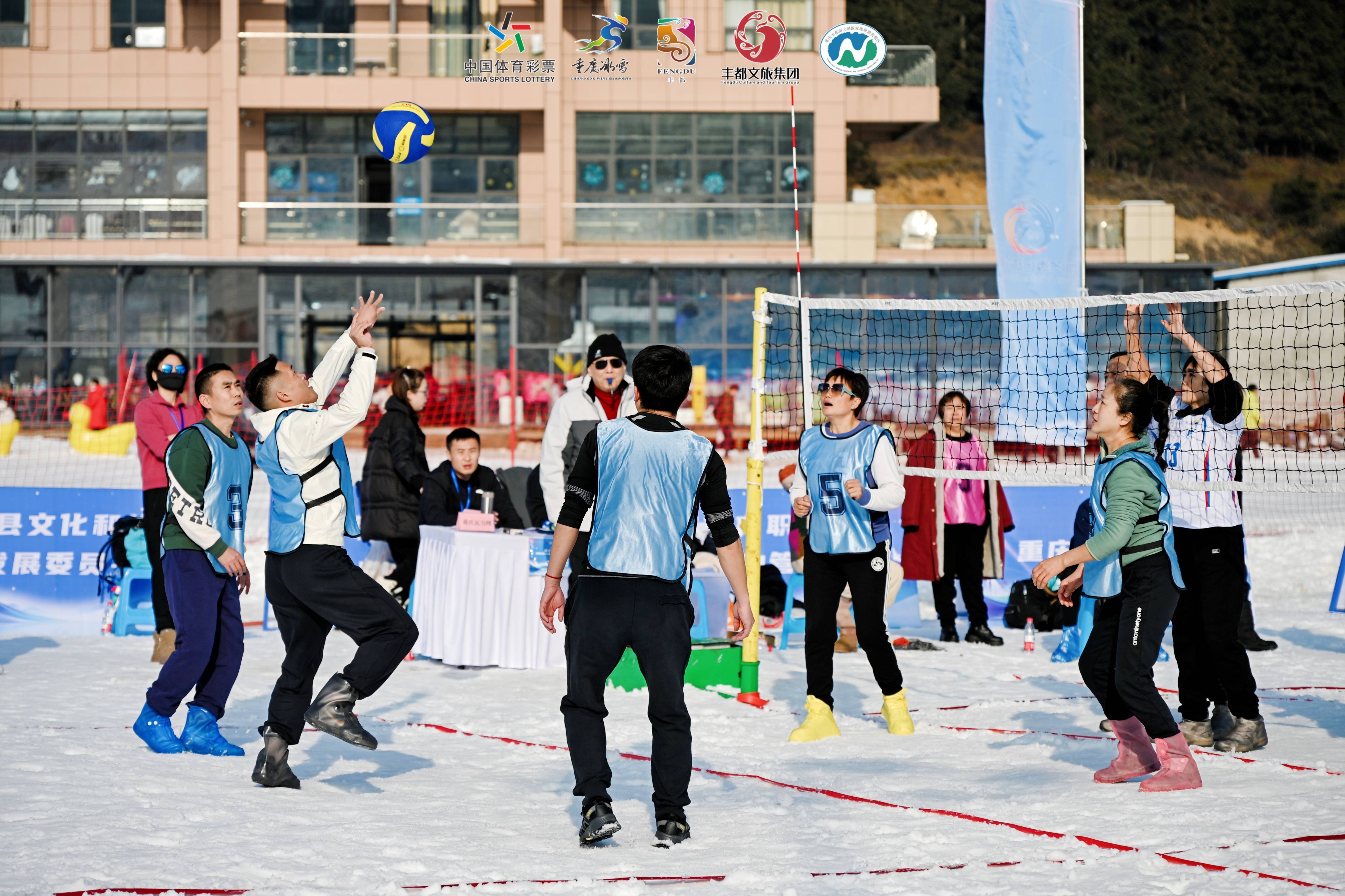 另一边,川渝雪地气排球邀请赛的比拼同样火热。来自川渝两地的参赛选手在雪地上传球、拦网、扣杀......展开了一场雪地间的团队热血较量。与此同时,川渝滑雪挑战赛场也在上演冰雪版“速度与激情”