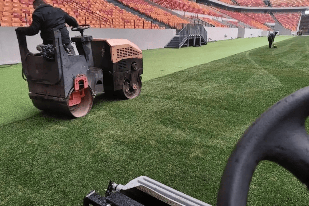 草坪已经铺完了。68米×105米的标准尺寸,冬季草,精细化养护,就等开赛。更衣室还配了室内热身场,铺满人工草坪,球员上场前状态能拉满。