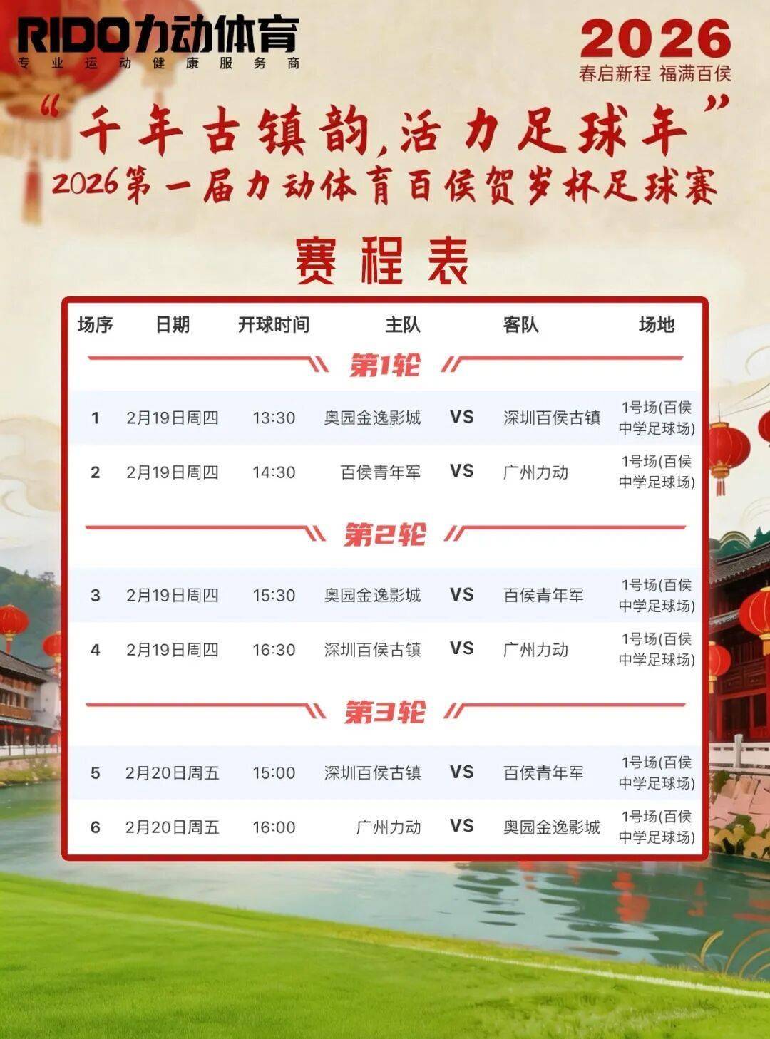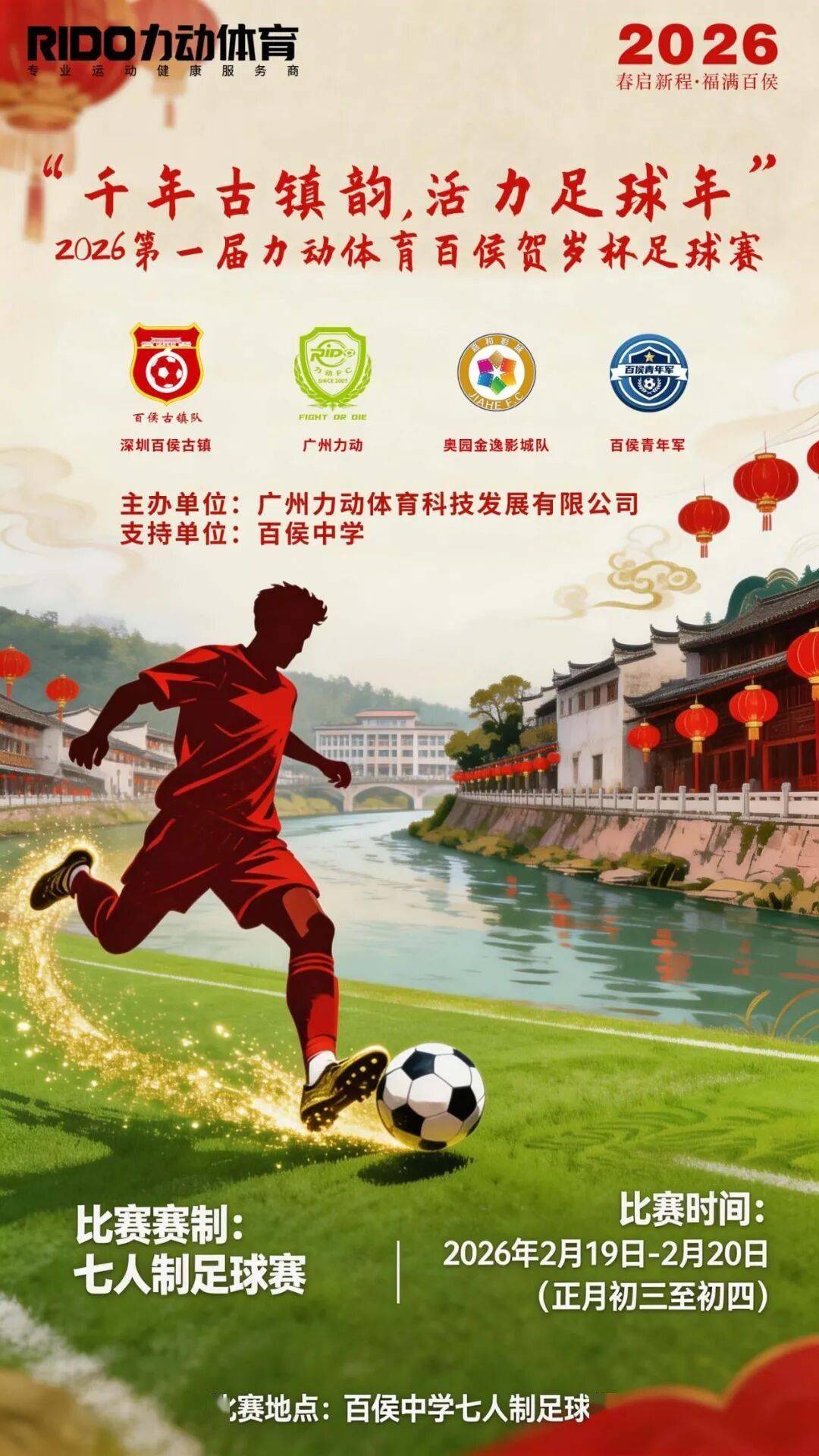 渝超,重庆城市足球联赛,渝超赛程,渝超直播,渝超积分榜,渝超球队/渝超(重庆城市足球联赛)为重庆足球迷带来最新赛程、比分、积分榜、球队信息及直播入口,精彩赛事一网打尽。新春将至,绿茵传情。为传承千年古镇文化,点燃全民健身热情,由广州力动体育科技发展有限公司主办、百侯中学支持的“2026第一届力动体育百侯贺岁杯足球赛”,将于2026年2月19日至20日(正月初三至初四)在百侯中学七人制足球场正式开赛。