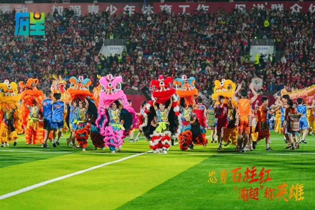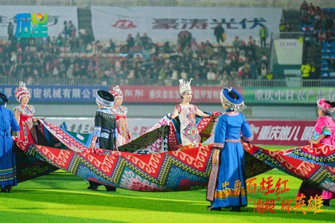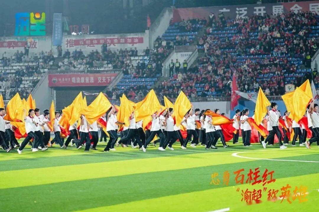 11月8日晚,石柱对阵黔江的比赛,石柱县体育场座无虚席,一场融合本土风情与体育精神的特色文艺展演精彩上演。气势恢宏的大型旗秀《红旗颂》、三河女子足球队队员身着统一队服集体亮相,激励着现场观众为梦想拼搏。