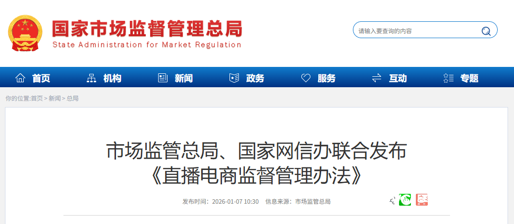 1月7日,市场监管总局、国家网信办联合印发了《网络交易平台规则监督管理办法》与《直播电商监督管理办法》。