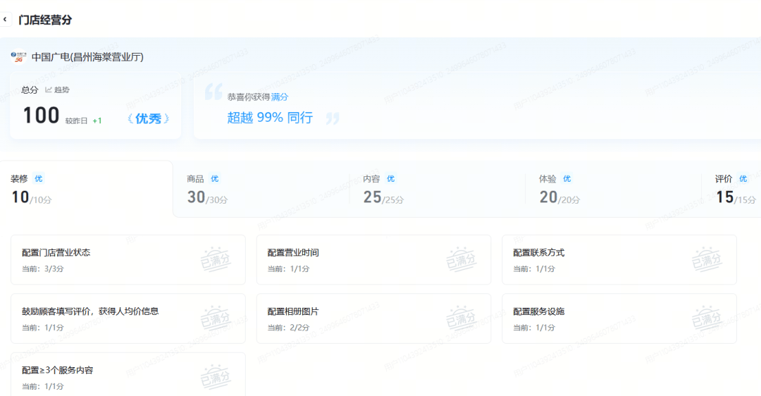 抖音门店经营分率先达到100分。门店经营评分包括装修、商品、内容、体验、客户评价五个维度。棠香营业厅、昌州海棠营业厅以五项全优获得满分。这是两家分公司严格按照重庆公司抖音直播“11332”运营体系要求,扎实做好落地执行所取得的成绩。