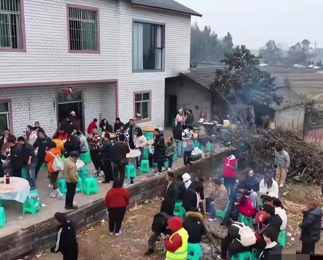 有人刷碗、有人切菜、有人站在路口指挥交通,哪怕是开着豪车来的人,也蹲在灶前加柴。
