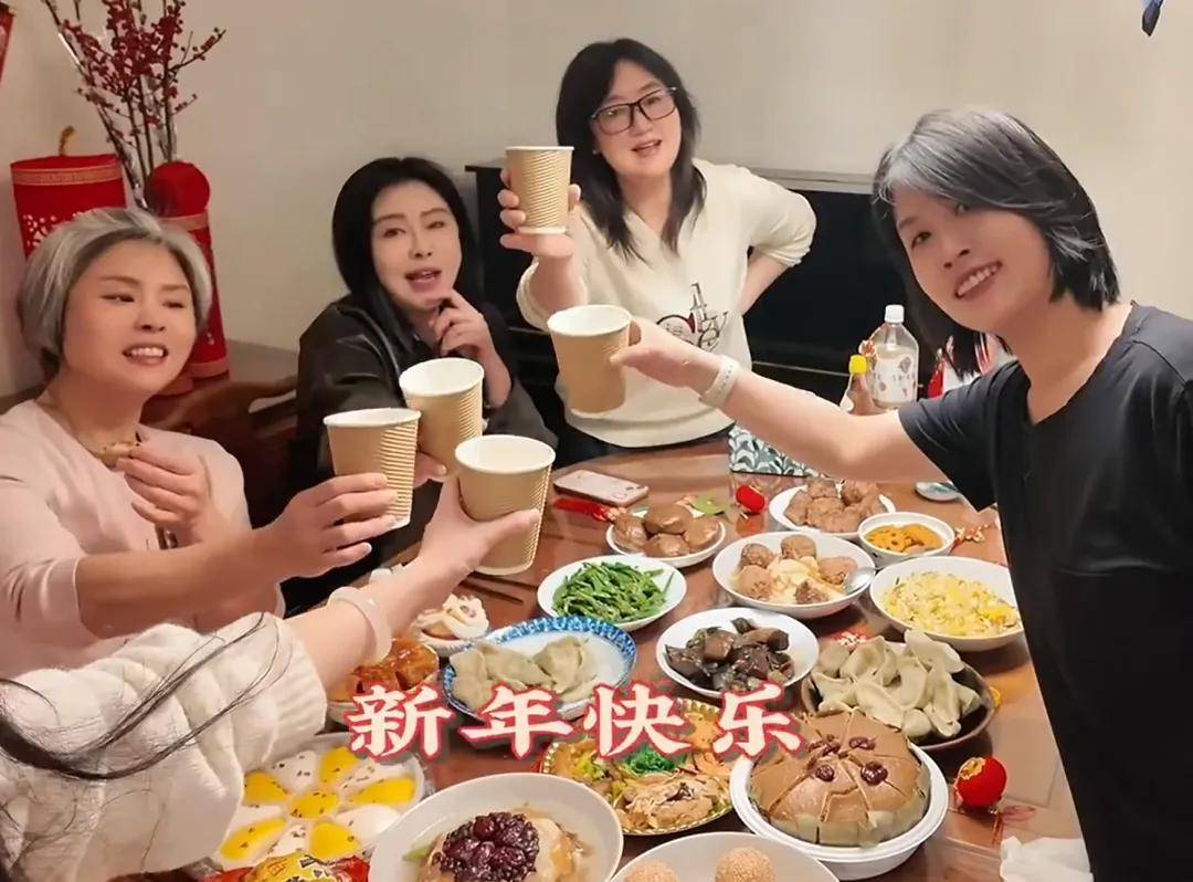 亲友们一起拿着饺子拍照,举杯祝福大家新年快乐。59岁的王祖贤状态依旧很不错,头发又黑又茂密,完全看不出是快60岁的人。