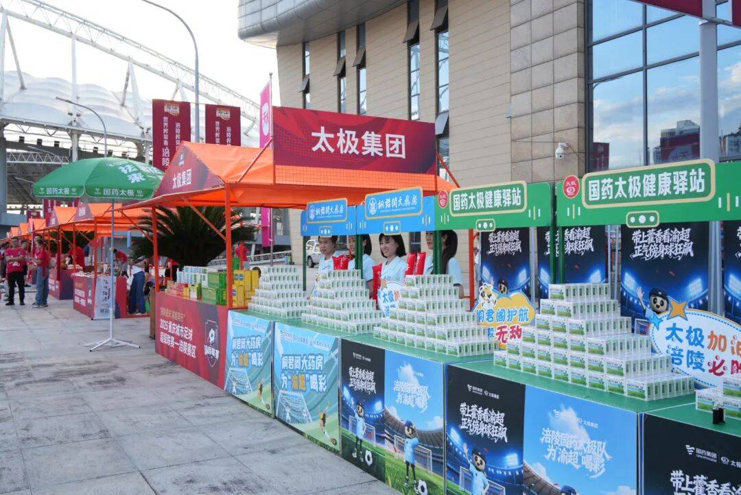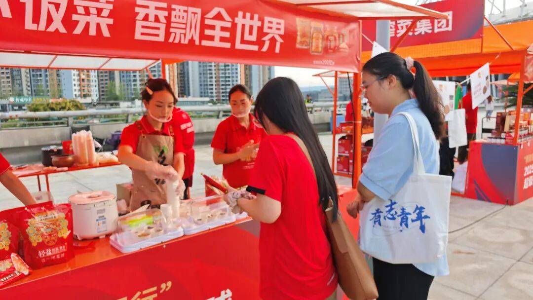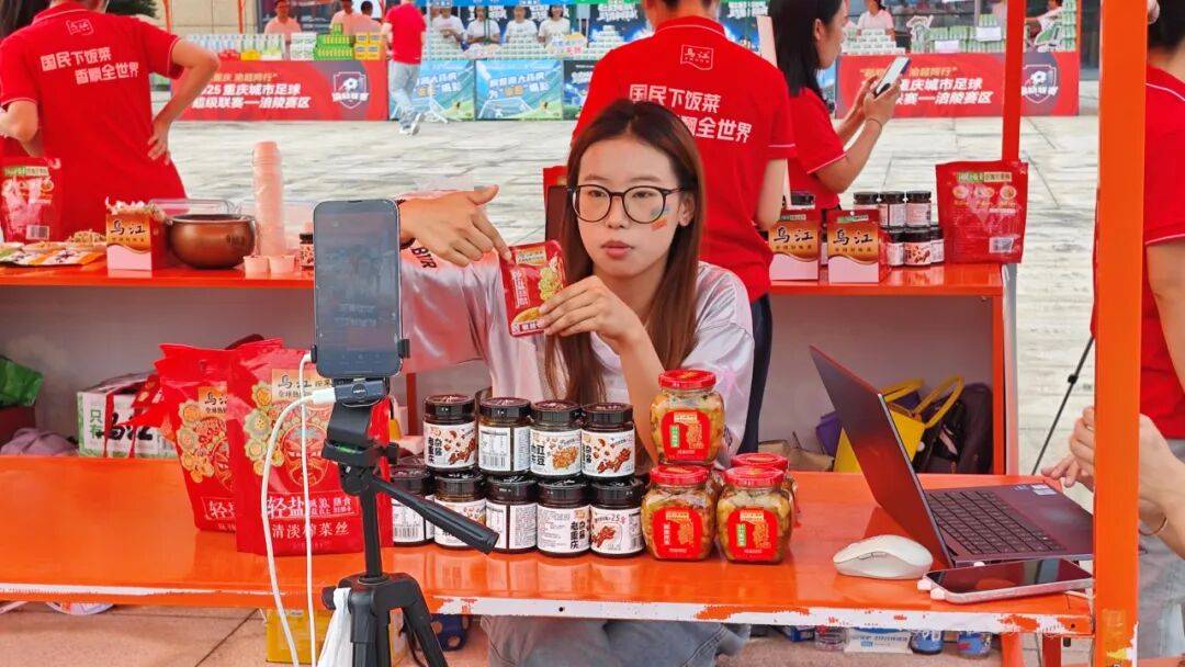 当天下午四点,涪陵奥体中心入口处十余个展台有序排列。涪陵榨菜、涪陵黑猪、袁朝辉油醪糟等本土美食吸引众多球迷驻足品尝。现场更以“线下展销+线上直播”双线联动的方式,让未能亲临现场的球迷也能“云”享主场热情、选购地道涪陵特产。